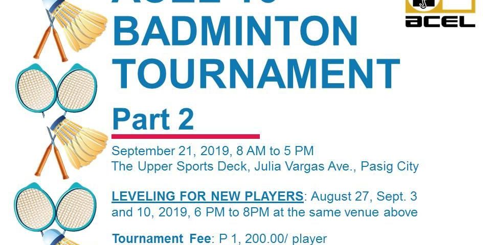Aug152019EventsSeptember 21, 2019, 8 am to 5 pm The Upper Sports Deck, Julia Vargas Ave., Pasig City Category: EventsBy acelmaryAugust 15, 2019Post navigationPreviousPrevious post:ACEL supporters feted in ‘Sponsors’ Night’NextNext post:ACEL’s 3rd General Membership MeetingRelated PostsACEL to stage 1st Kasalang Bayan this OctoberJune 5, 2023ACEL to hold GMM this May 31May 19, 2023ACEL offering 3 technoforums at upcoming Philconstruct VisayasMay 19, 2023ACEL offering 4 technoforums at upcoming Philconstruct ManilaOctober 17, 2022ACEL’s 17th Badminton Tournament set for Oct. 8; registration going onOctober 2, 2022ACEL to offer 3 technoforums at Philconstruct Mindanao in SeptemberAugust 24, 2022