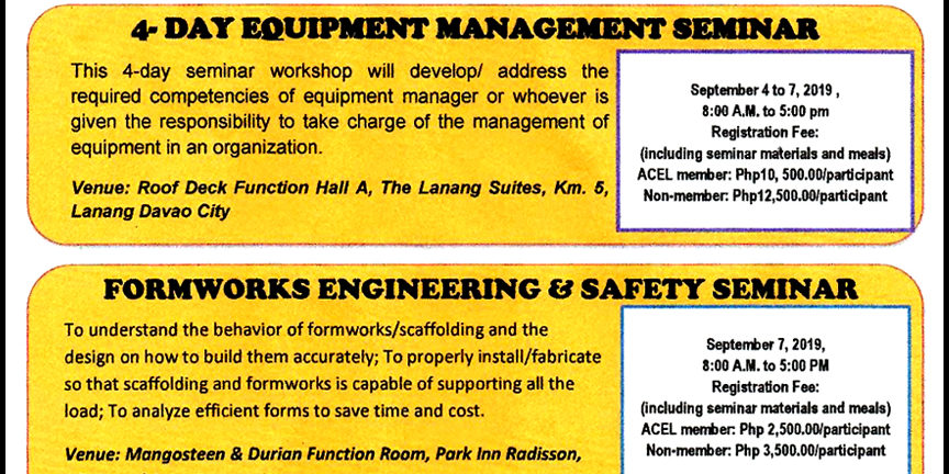 Aug82019EventsIn partnership with CMDF-DTI / Register Now! Category: EventsBy acelmaryAugust 8, 2019Post navigationPreviousPrevious post:ACEL’s 3rd General Membership MeetingNextNext post:ACEL offers technoforums at Philconstruct Visayas 2019Related PostsACEL to stage 1st Kasalang Bayan this OctoberJune 5, 2023ACEL to hold GMM this May 31May 19, 2023ACEL offering 3 technoforums at upcoming Philconstruct VisayasMay 19, 2023ACEL offering 4 technoforums at upcoming Philconstruct ManilaOctober 17, 2022ACEL’s 17th Badminton Tournament set for Oct. 8; registration going onOctober 2, 2022ACEL to offer 3 technoforums at Philconstruct Mindanao in SeptemberAugust 24, 2022